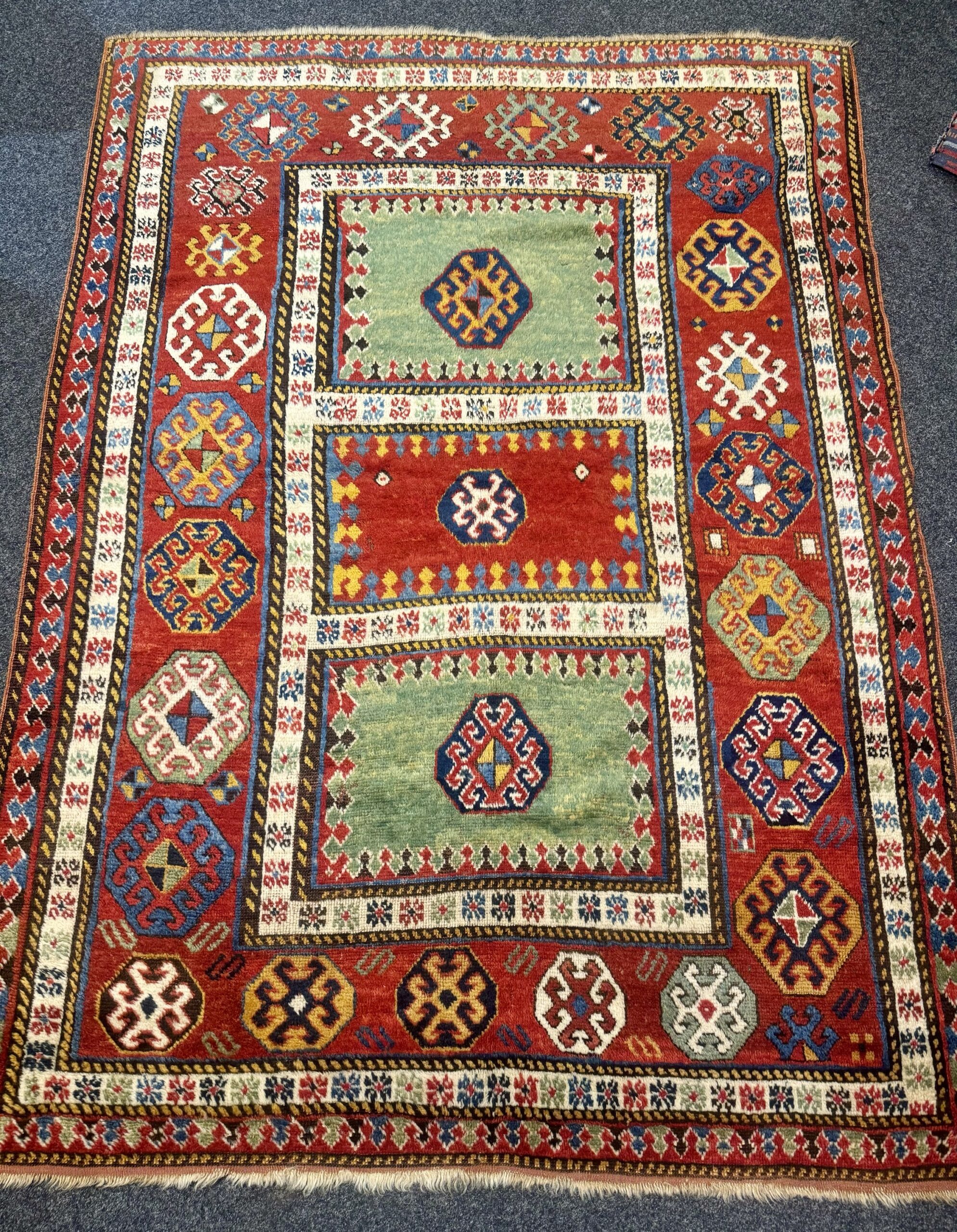 Ein antiker Kazak-Teppich mit 3 Feldern, circa 150 Jahre alt.