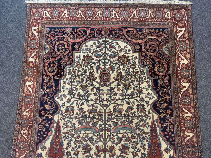 Ein außergewöhnlich elegantes Beispiel persischer Teppichkunst: dieser antike Saruk-Farahan Teppich (ca. 200 × 130 cm) besticht durch seine feine Knüpfung, die harmonische helle Fondfarbe und die reiche, traditionelle Ornamentik. Das zentrale Motiv zeigt ein prachtvolles „Tree of Life“ (Lebensbaum)-Design, eingebettet in filigrane florale Ranken und eingerahmt von einer kunstvoll gestalteten Bordüre — ein Stück, das jeden Raum aufwertet und zugleich Geschichte erzählt.