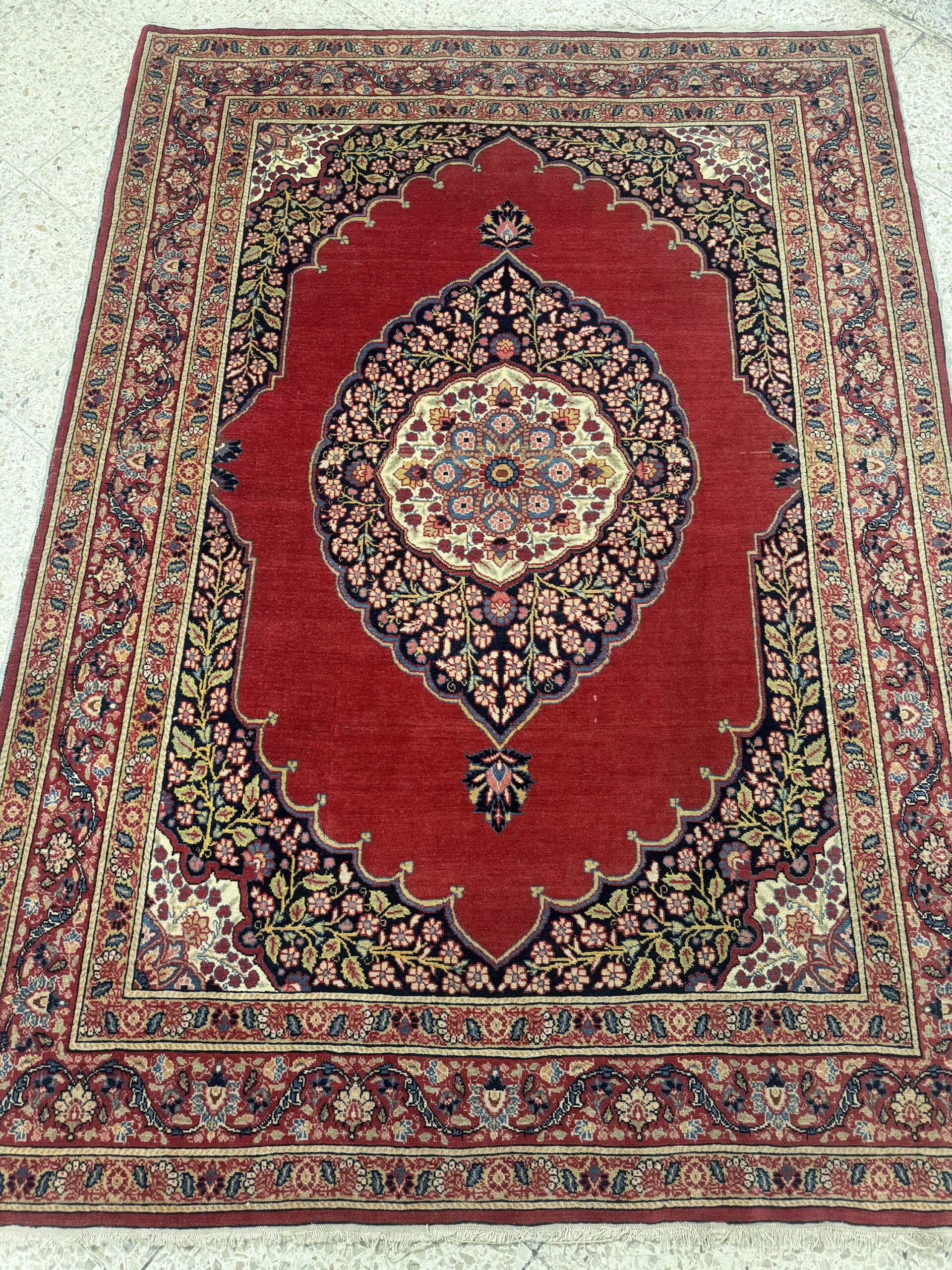Das zentrale Medaillon, umrahmt von filigranen floralen Ornamenten und einer detailreichen Bordüre, verleiht dem Teppich eine harmonische Balance zwischen Eleganz und Ausdruckskraft. Die warme Rotpalette kombiniert mit dunklen Konturen erzeugt Tiefe und Präsenz – typisch für hochwertige antike Tabriz-Teppiche des 19. und frühen 20. Jahrhunderts.