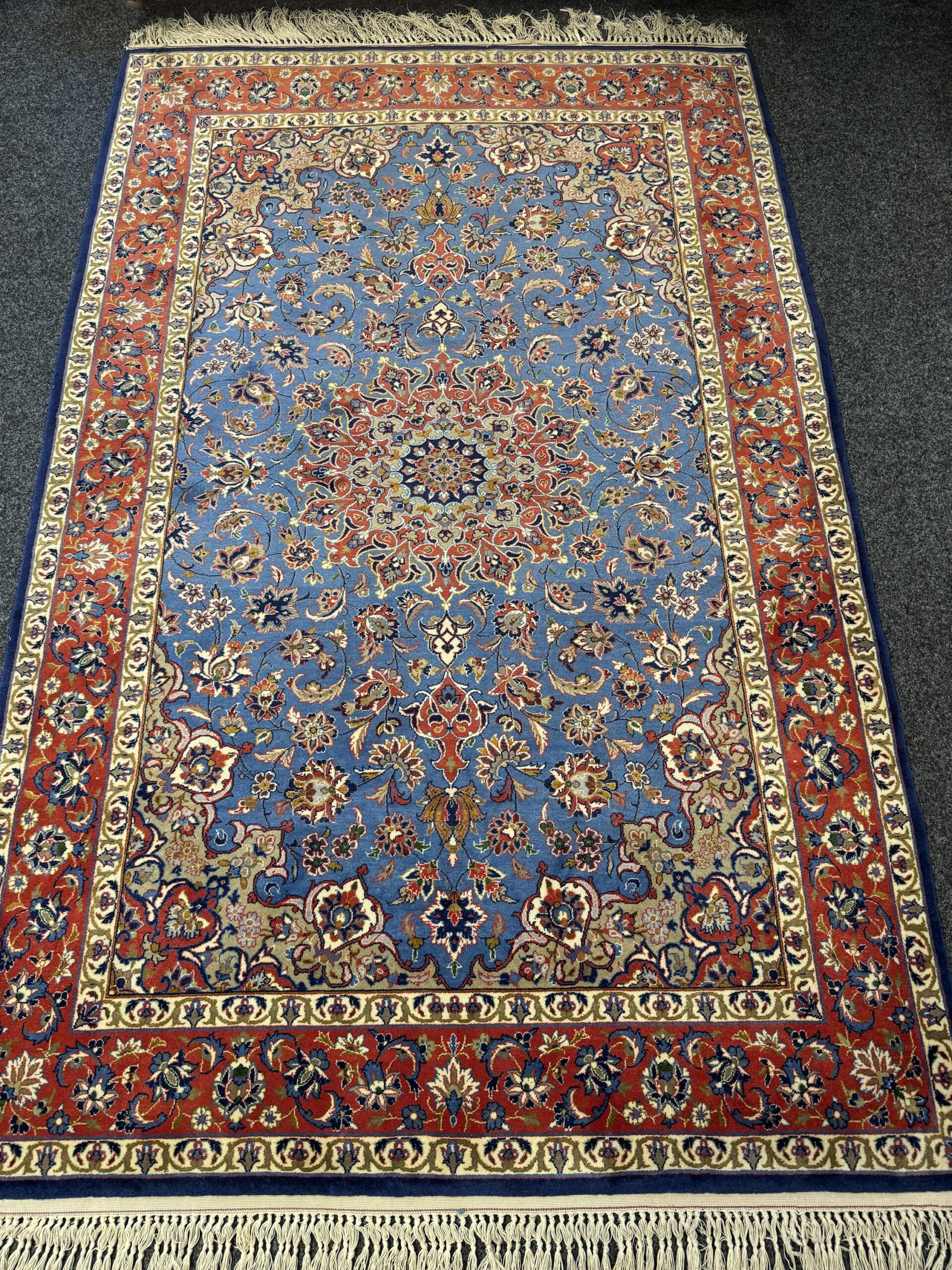 Dieser außergewöhnlich feine Isfahan Teppich ist ein echtes Meisterwerk persischer Teppichkunst. Mit einer Größe von ca. 175x115cm und einer wunderschönen hellblauen Grundfarbe verkörpert er die Eleganz und Raffinesse, für die Isfahan seit Jahrhunderten bekannt ist.