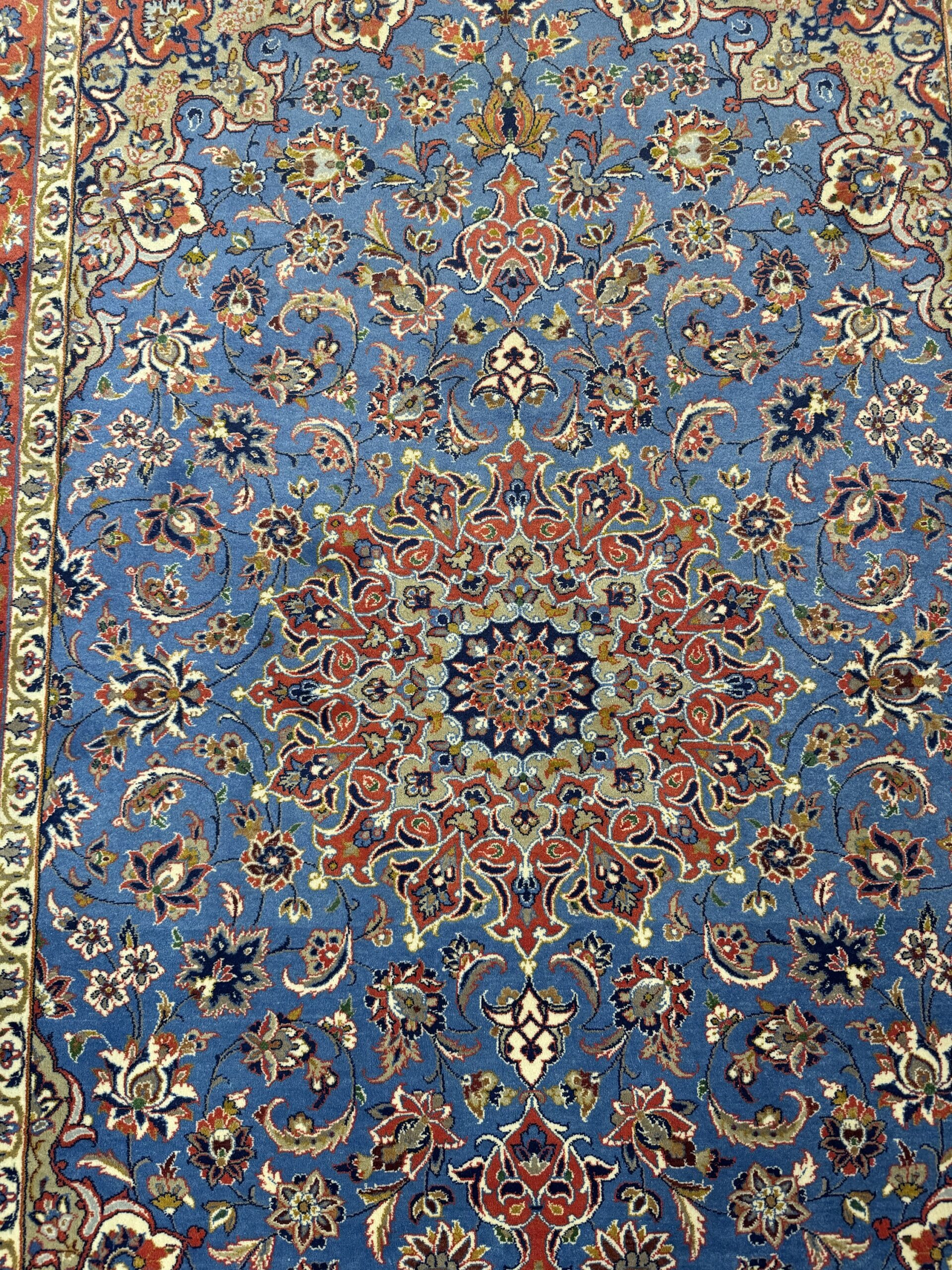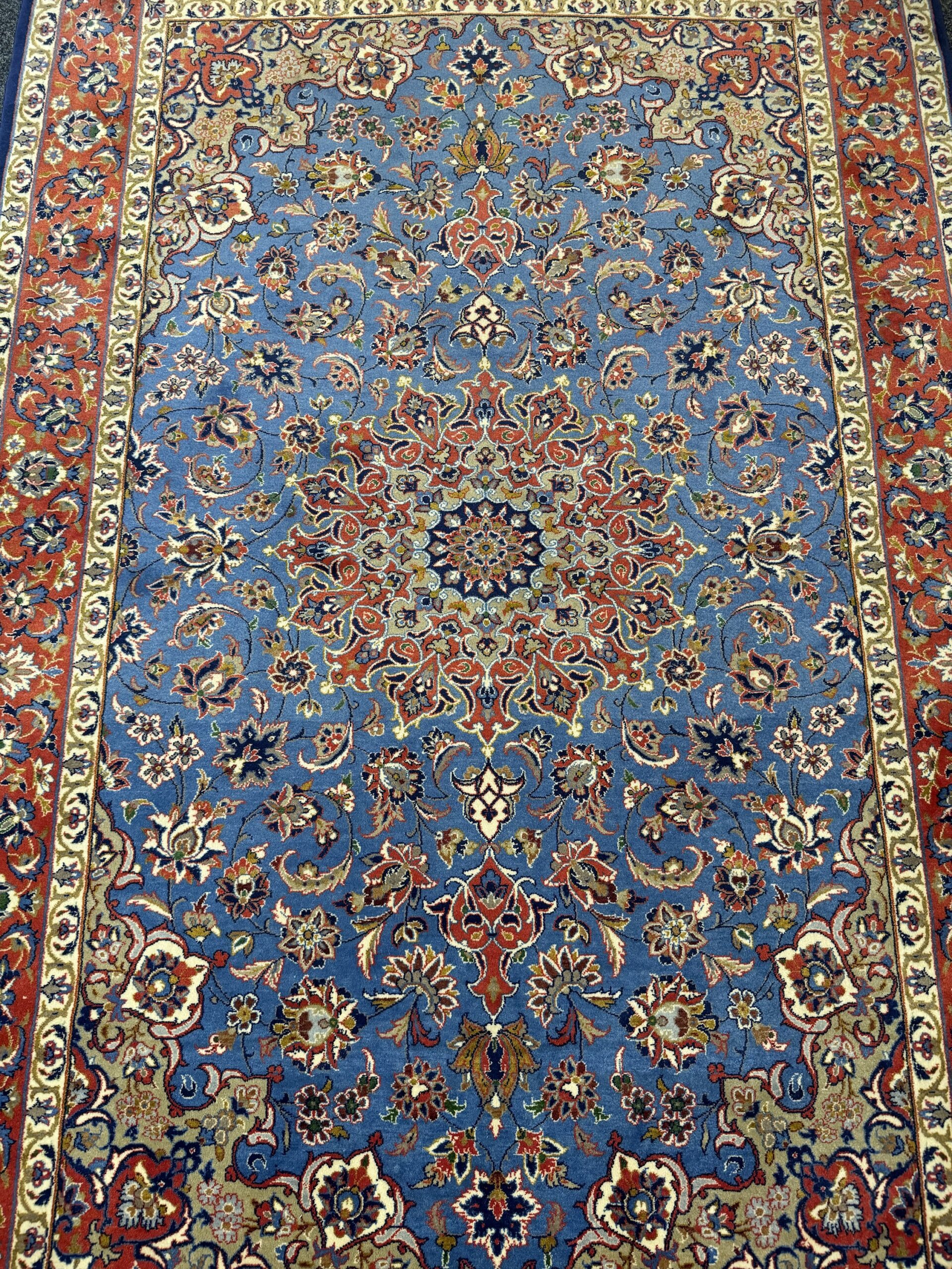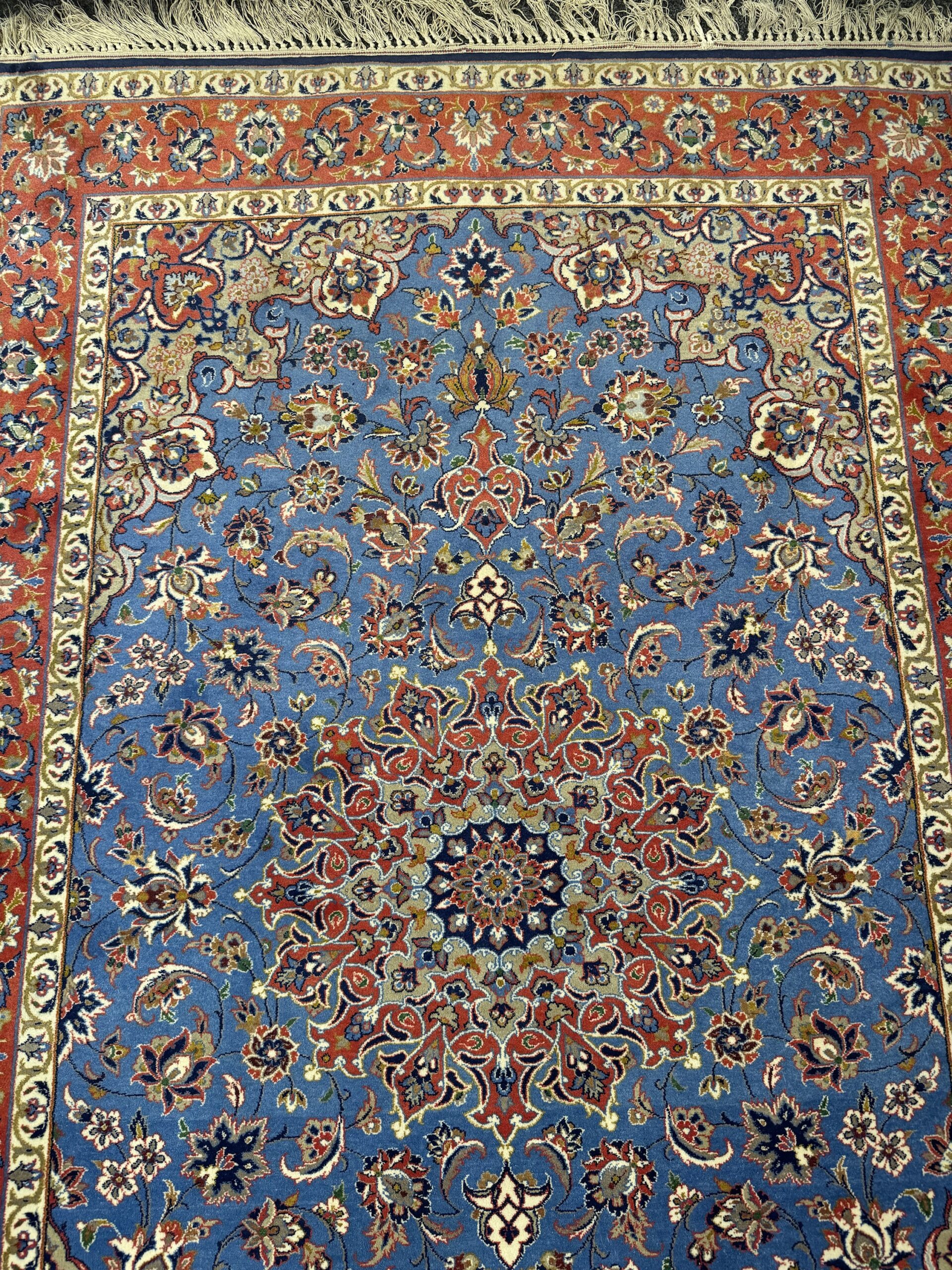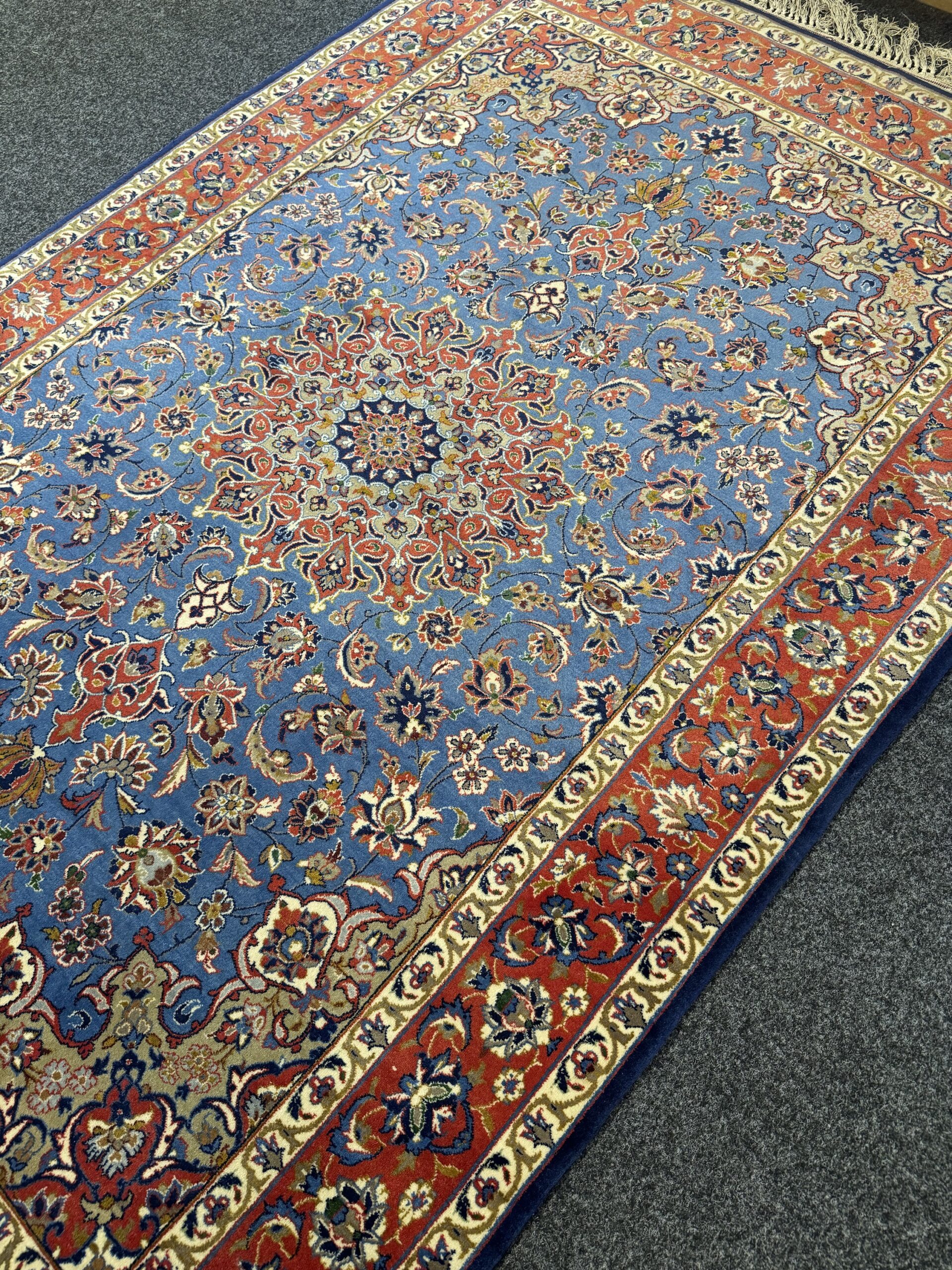 Dieser Isfahan-Teppich ist kein herkömmlicher Bodenbelag, sondern ein Kunstwerk, das jede Einrichtung bereichert – ob klassisch oder modern.