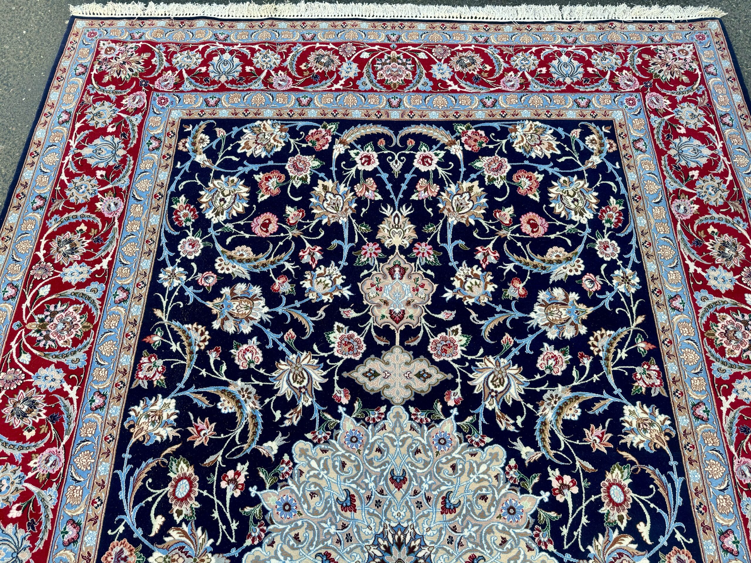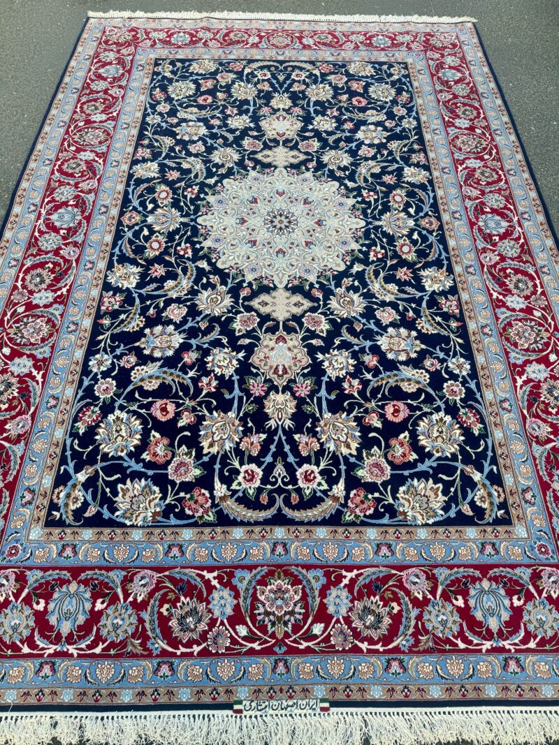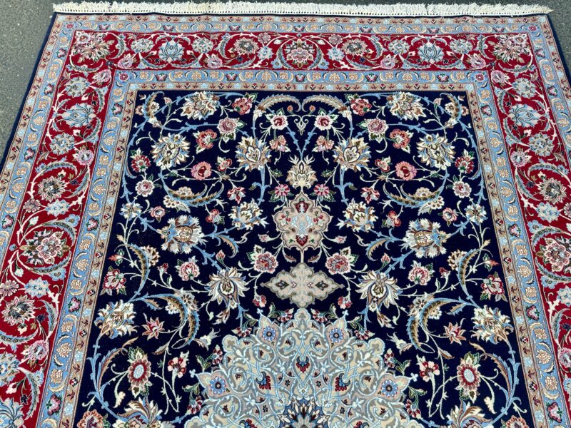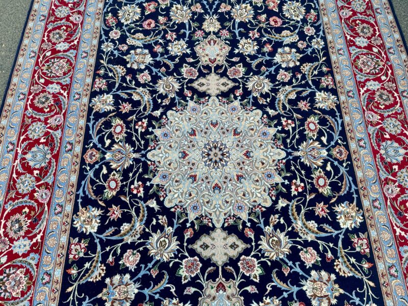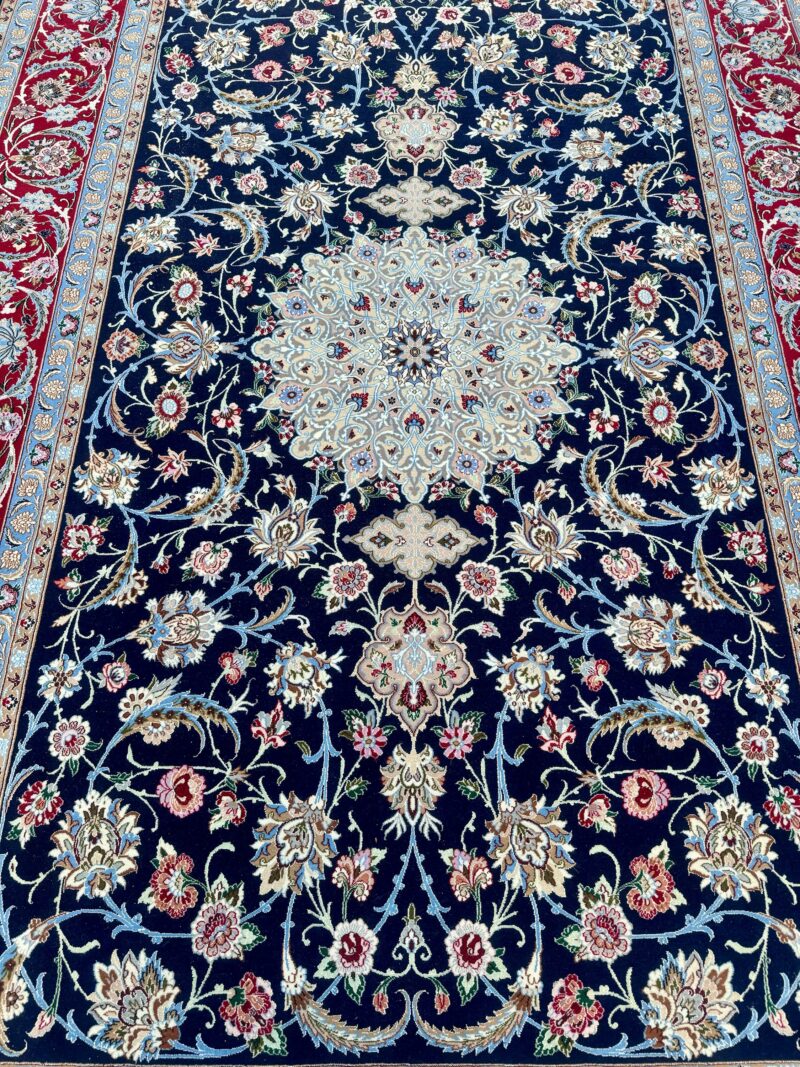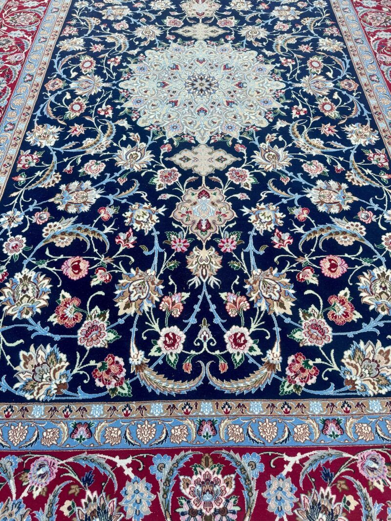 Dieser Teppich besticht durch seine außergewöhnlich feine Knüpfung und die harmonische Komposition aus tiefblauer Grundfarbe, einem prächtigen zentralen Medallion in Elfenbein und Himmelblau sowie einer bordauxroten Bordüre aus Palmetten und Wellenranken, die das Gesamtbild majestätisch rahmt. Die Kombination aus Wolle und Seide verleiht ihm einen dezenten Glanz und macht ihn zu einem echten Blickfang in jedem Raum.