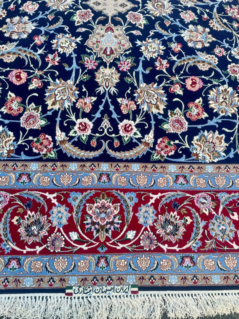Ein hochfeiner, signierter Isfahan Teppich aus der renommierten Meistermanufaktur Enteshari (انتشاری). Diese Manufaktur zählt zu den angesehensten Werkstätten Isfahans und ist bekannt für ihre außergewöhnliche Präzision und künstlerische Gestaltung.